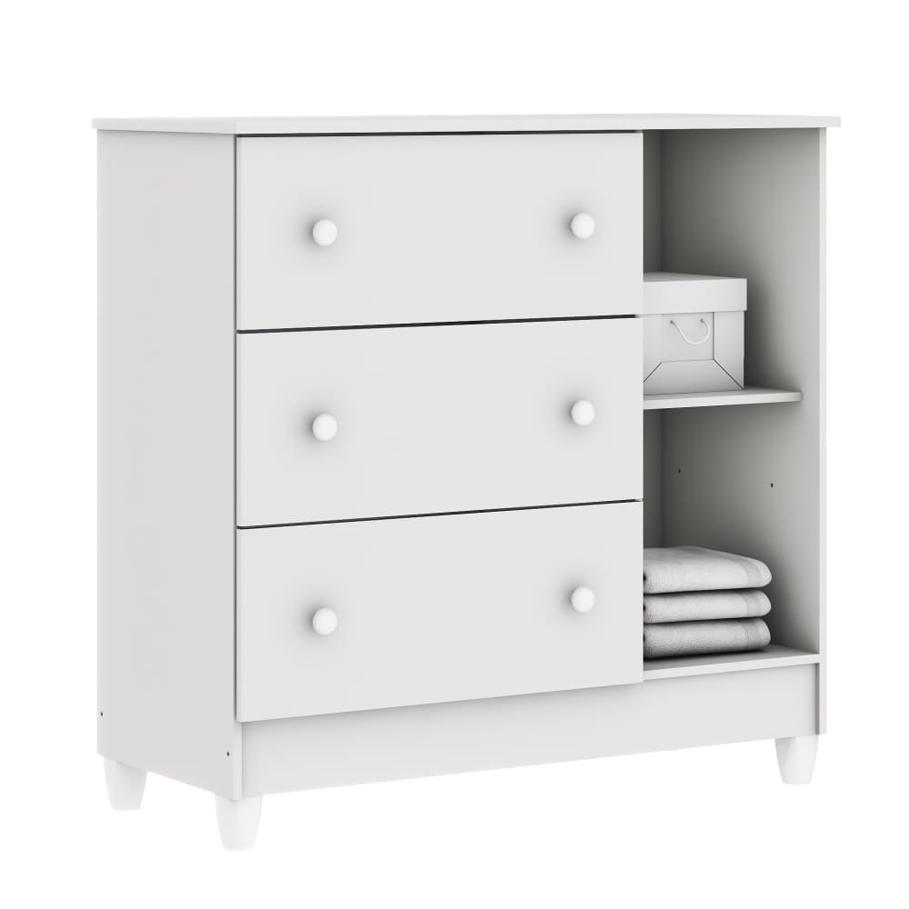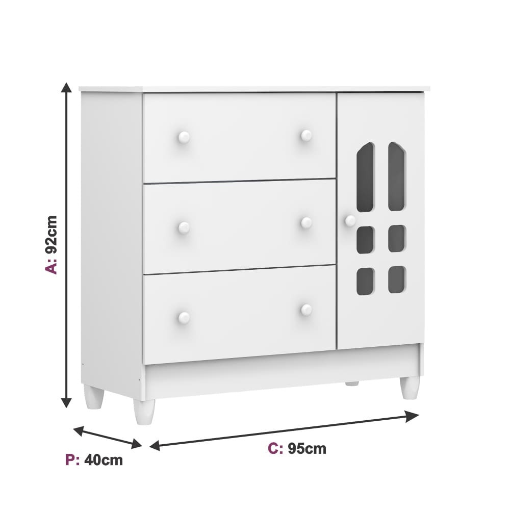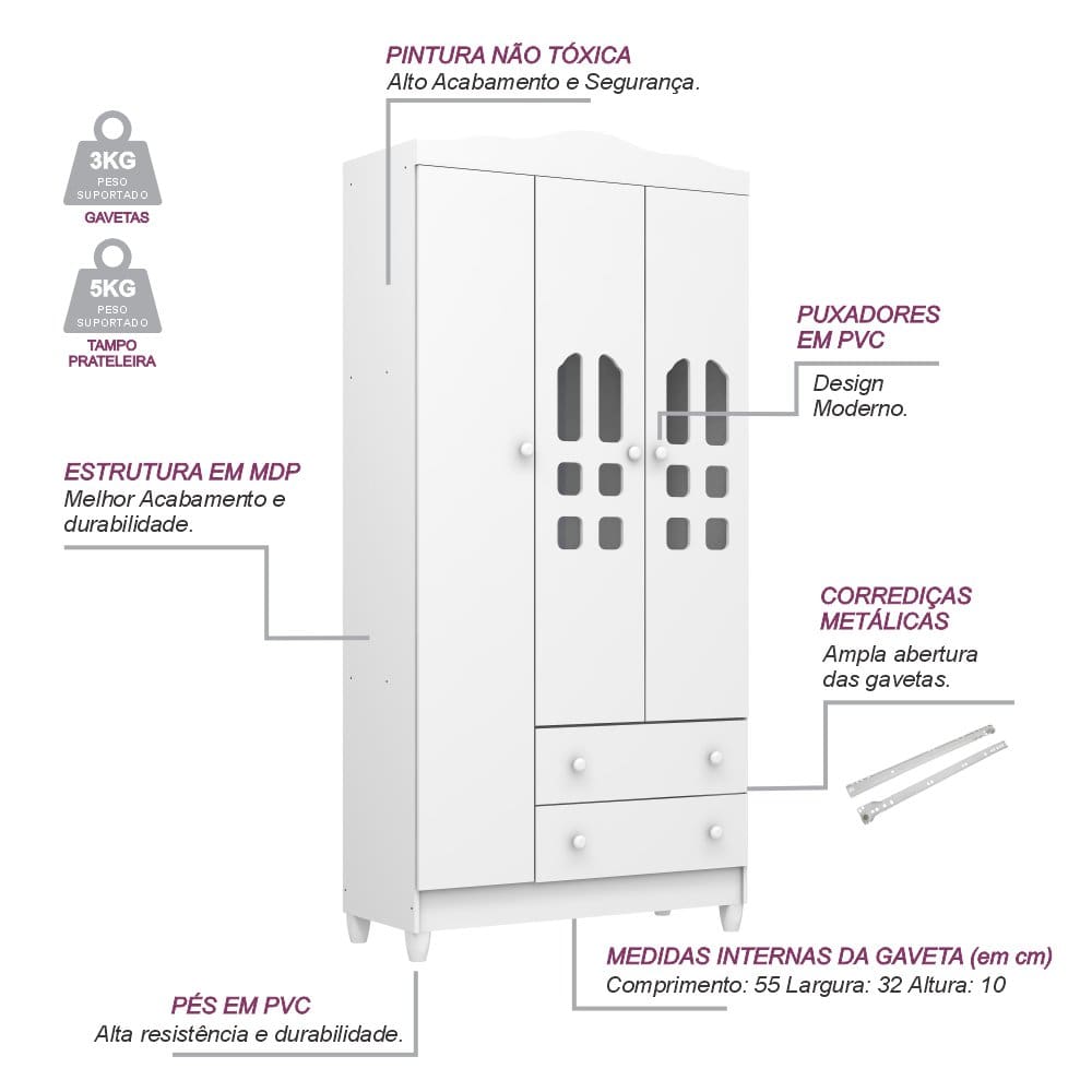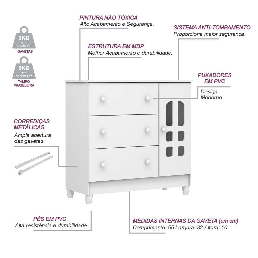 Quarto de Bebê Completo Carolina Baby – um sonho de quartinho! O Quarto de Bebê Completo Carolina Baby reúne praticidade, funcionalidade e estilo em um só conjunto. Composto pelo berço mini-cama Mirelle, a cômoda Eloa e o guarda-roupa Eloá, este kit organiza e decora o ambiente do seu bebê com elegância e segurança. Cômoda Infantil Carolina Baby Eloá A Cômoda Infantil Carolina Baby Eloá possui 3 gavetas, 1 porta com vitrine em acrílico e 1 prateleira. Conta com fraldário integrado, sistema antitombamento, corrediças telescópicas e dobradiças metálicas, garantindo praticidade e durabilidade no dia a dia. Dimensões cômoda: 92,50x95x41cm. Berço Mini-Cama Carolina Baby Mirelle O Berço Mini-Cama Carolina Baby Mirelle é versátil e acompanha o crescimento da criança, pois se transforma em mini-cama. Com acabamento em pintura UV atóxica, suporte para mosquiteiro, regulagem de altura do colchão e rodízios com travas, oferece segurança e conforto para o bebê. Dimensões: 101x15,40x78cm e suporte até 30kg. Guarda-Roupa Infantil Carolina Baby Eloá Já o Guarda-Roupa Infantil Carolina Baby Eloá conta com 3 portas, 2 gavetas e 4 prateleiras, além de vitrine em acrílico que facilita a visualização dos itens. Fabricado em MDF com pés em PVC, apresenta pintura laqueada fosco com laterais amadeiradas e acabamento UV atóxico, unindo durabilidade e design moderno. Dimensões: 196x94x40cm e Peso: 51,50 kg.