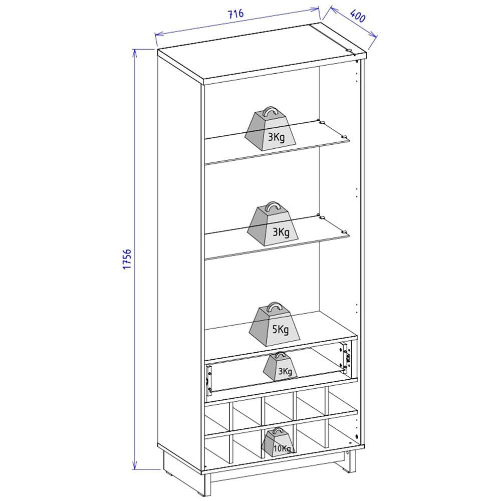 Possui uma adega com espaço para 10 garrafas e uma gaveta interna para guardar travessas e aparelhos de jantar. Outro destaque são as portas de vidro, estilo retrô, que deixa todo o conteúdo interno à vista, tornando o móvel ainda mais charmoso e prático no seu dia a dia.