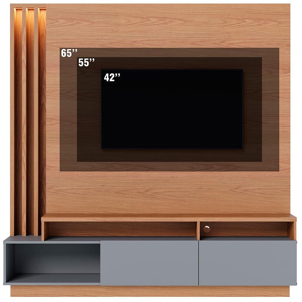 Com um painel que suporta TV’s de até 65 polegadas, possui detalhes de ripados decorativos em sua lateral, iluminados por uma canaleta de led que proporcionam uma ambientação sofisticada e aconchegante para sala.