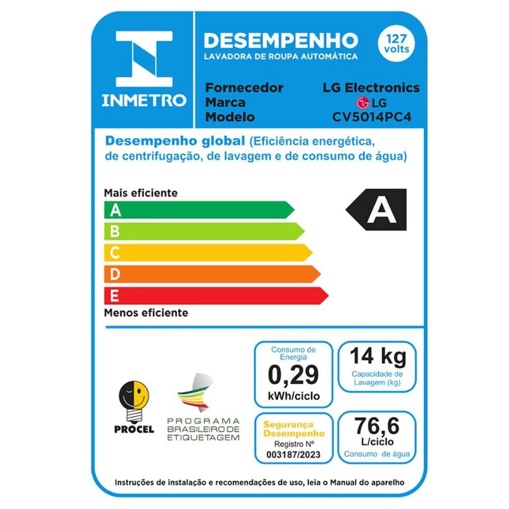 Capacidade (kg de roupas): Lavagem: 14kg / Secagem: 8kg