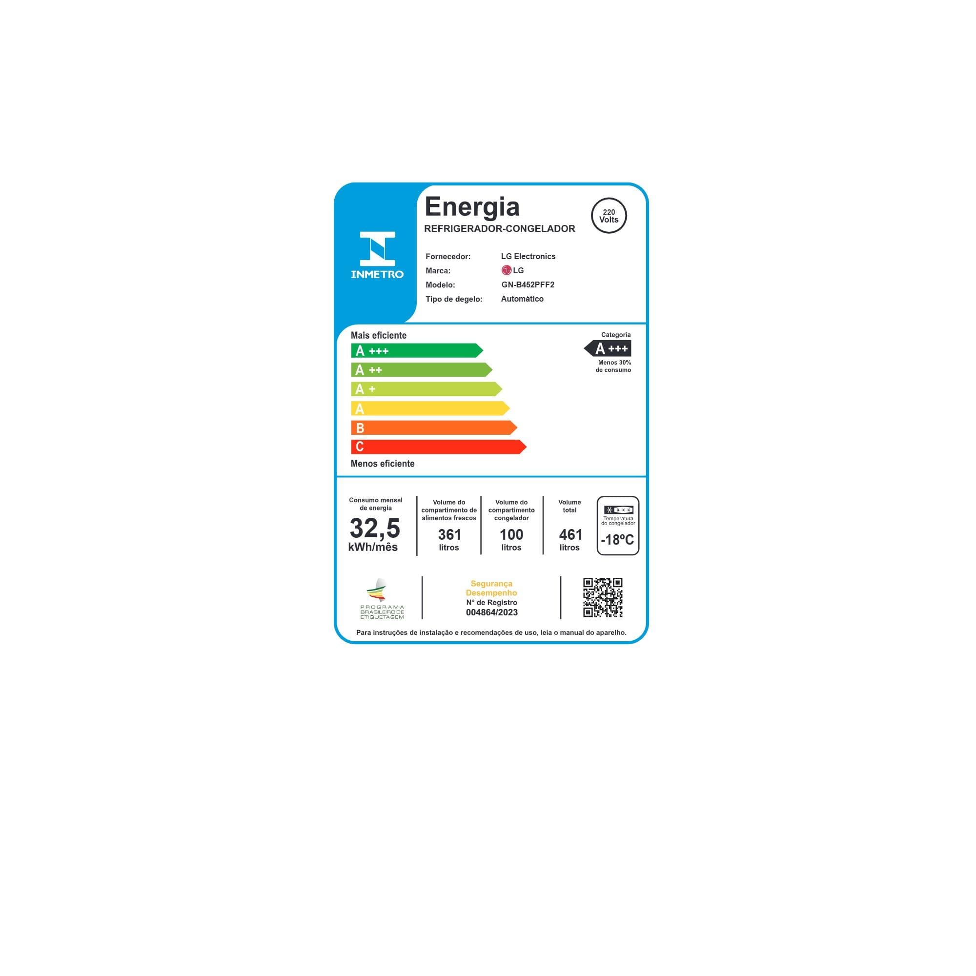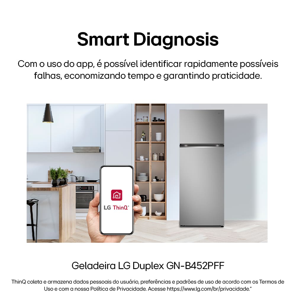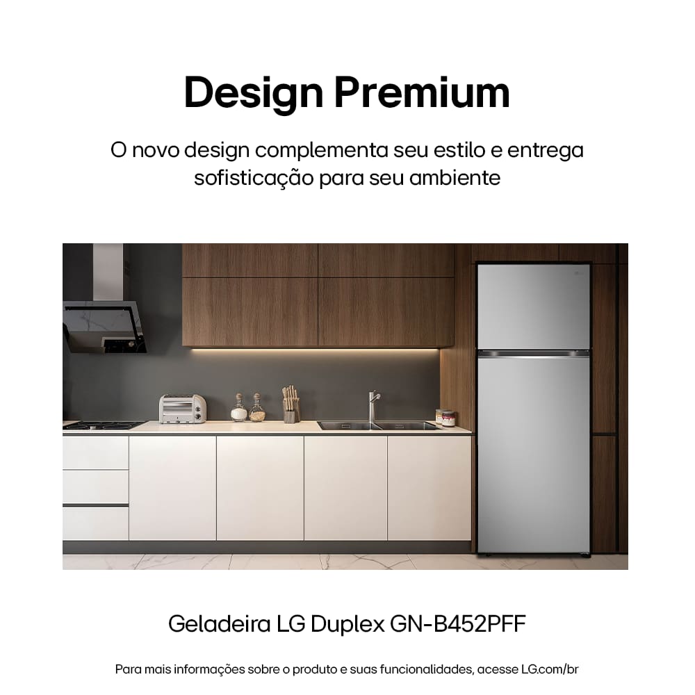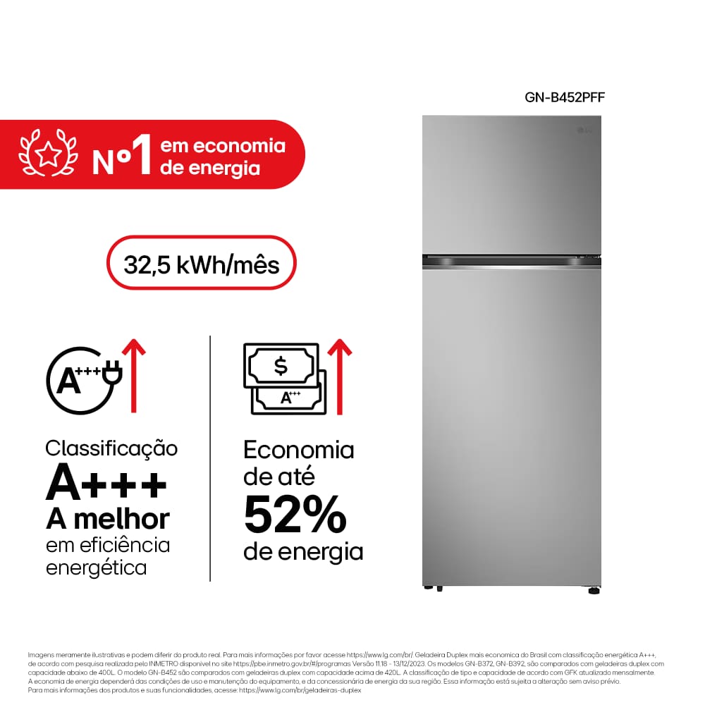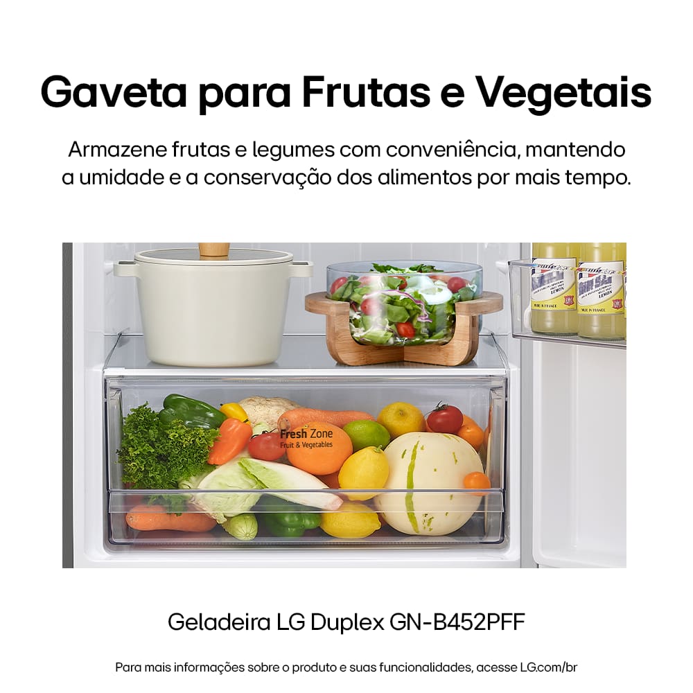 Conteúdo da embalagem: -1 Geladeira LG Frost Free GN-B452PFF Duplex com Tecnologia Smart Inverter, Linear Cooling e DoorCooling Inox Look - 461 litros.