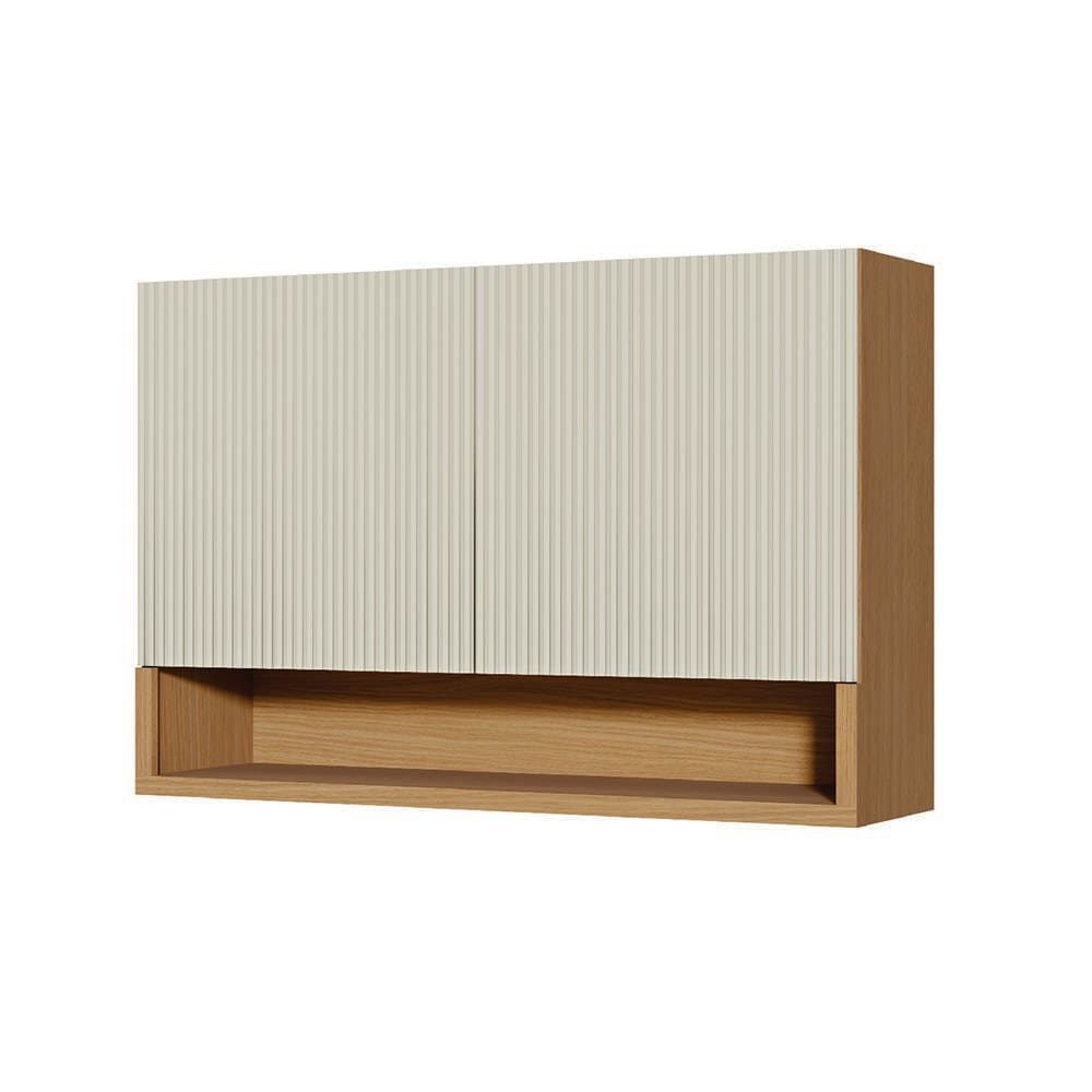 O Armário Aéreo Nesher Simone Mendes é resultado de uma parceria com a cantora Simone Mendes e traz ao ambiente um toque exclusivo de elegância. Com 120 cm de largura, conta com 2 portas e 2 prateleiras internas, oferecendo excelente capacidade de organização. As portas ripadas caneladas na cor Greige — tendência global no design de interiores — combinam perfeitamente com o corpo em Carvalho, criando um visual contemporâneo e acolhedor.