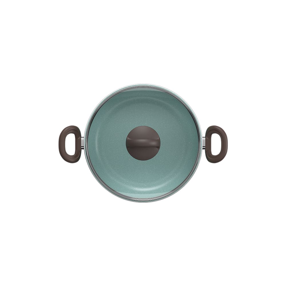 Fabricada em alumínio com revestimento antiaderente Mineral Resist em 6 camadas, proporciona um cozimento mais saudável, já que exige menos óleo, além de facilitar a limpeza. Sua estrutura distribui o calor de forma uniforme, reduzindo o tempo de preparo e economizando energia.A tampa de vidro temperado com saída de vapor permite acompanhar o cozimento sem precisar abrir a panela, enquanto os cabos e pomel de baquelite 50% regenerado não aquecem, oferecendo mais segurança. O acabamento Verde adiciona requinte e modernidade à sua cozinha.