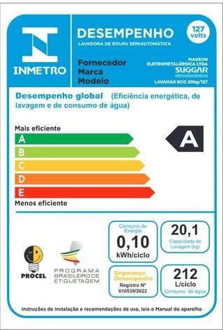 Conteúdo da embalagem: - 1 Lavadora Suggar Lavamax Eco 20kg